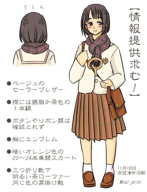 引きこもりとなってから町に出ることが少なくなったわけですが、そのぶん出た先で制服を見るとトキメキます。恋は罪悪ですが、その魔法はすべてを可能にするのです。相変わらず制服には知的好奇心しか向けていません。知らない制服はやはり名前を知りたくなります。先日も、白いセーラーブレザーに暗いオレンジのプリーツスカートという得体のしれない服を見つけました。どこの制服かとんと見当もつかない、それどころか制服か私服かも分からない、だけど私服でセーラーブレザーなんて存在しないだろうし何よりこんなにも俺の心を揺らすのだから制服に違いない! ……と思っていたら、後日、茶色いセーラーブレザー型の私服を見かけて絶望しているところです。でもあの子は素材がカッチリしているから制服のはずなんだぁ……。情報提供お願いします。クリックで拡大。