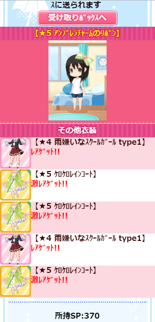 ちなみにスクショ撮り忘れたんですが、玉子の着てる上位報酬衣装のやつ、mobageランキング50位中50位でした。ひょえー!