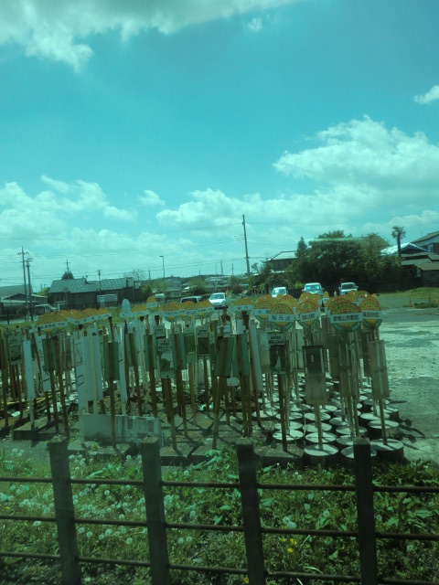 右:途中の駅で群れていた使われなくなったバス停の標柱