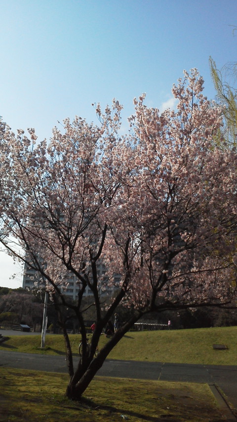 今日、公園へ犬の散歩に行ったら、桜の木が一本満開になっておりました。